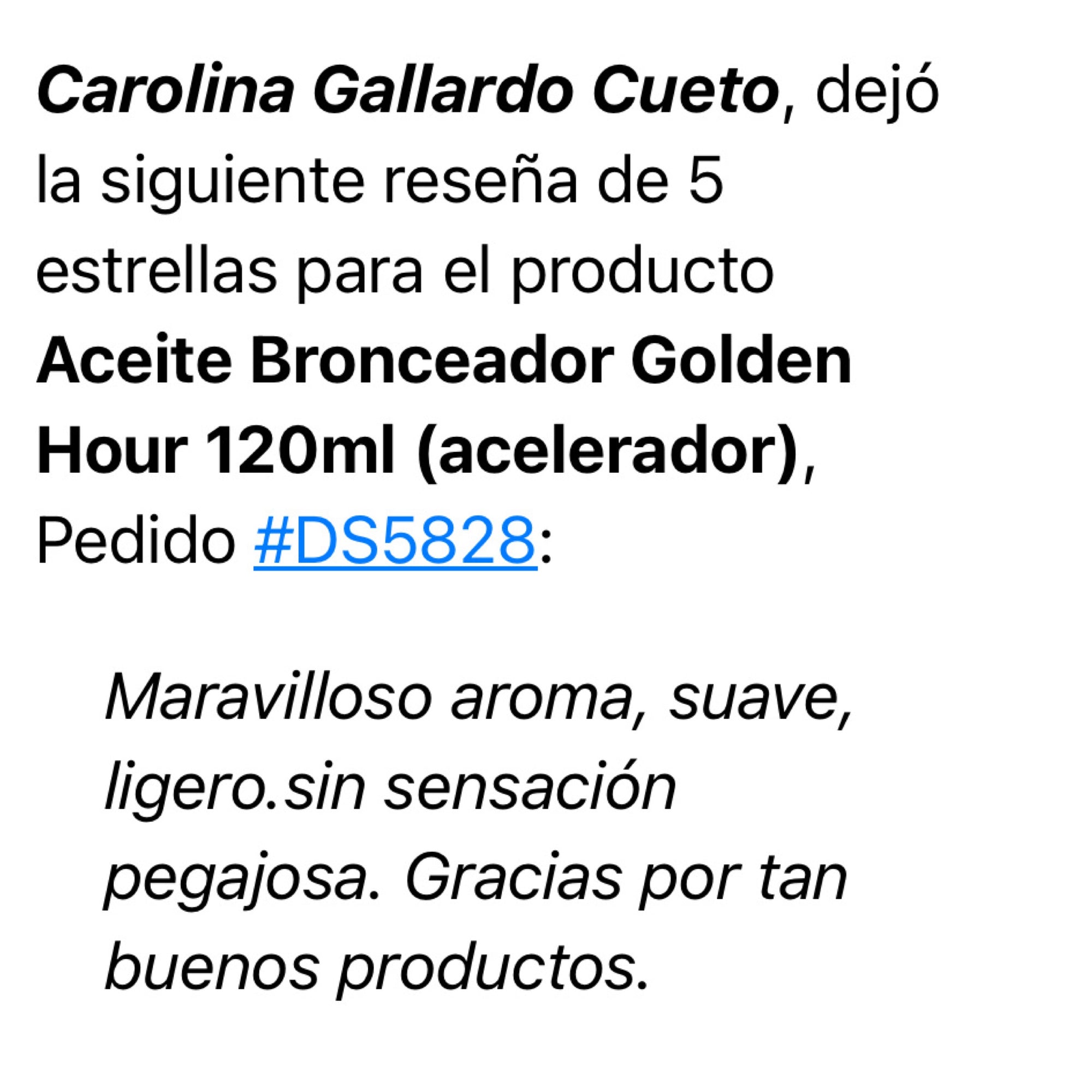 Todo se traduce en pieles doradas, firmes y bronceadas. Todos los colores del atardecer en todo tu cuerpo con un aroma a playa y Verano de esos que no se olvidan! *El nivel de llenado de tu Golden no es hasta la tapa, los 120 ml llegan un poco arriba de la etiqueta :) como se muestra en la segunda foto. (El producto puede ser líquido o espeso según el clima)